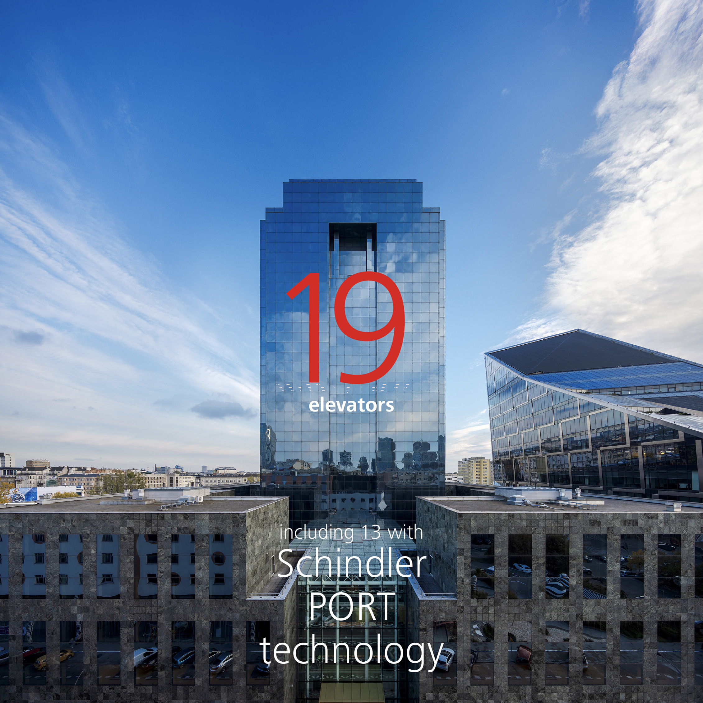 Das Projekt umfasste den Austausch von 19 Aufzügen: 13 Schindler 3000 im Hauptturm, alle gesteuert durch Schindler PORT, fünf Schindler 5000 für die vier Podien und einen Schindler 6000 für den Feuerwehreinsatz.