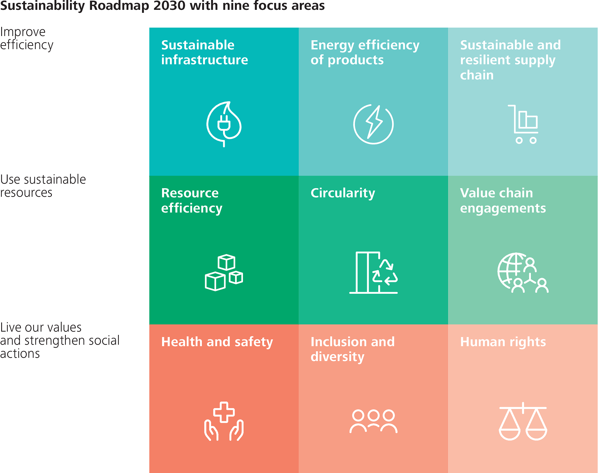 Unsere Nachhaltigkeits-Roadmap 2030, die im Jahr 2024 eingeführt wurde, bildet den Rahmen für unsere Umwelt- und Sozialinitiativen bis 2030. Sie umfasst neun Fokusbereiche – jeder mit klar definierten Zielen und Messgrössen –, um unser Geschäft sowie unsere Produkte und Dienstleistungen im Einklang mit unseren ESG-Ambitionen voranzubringen.
