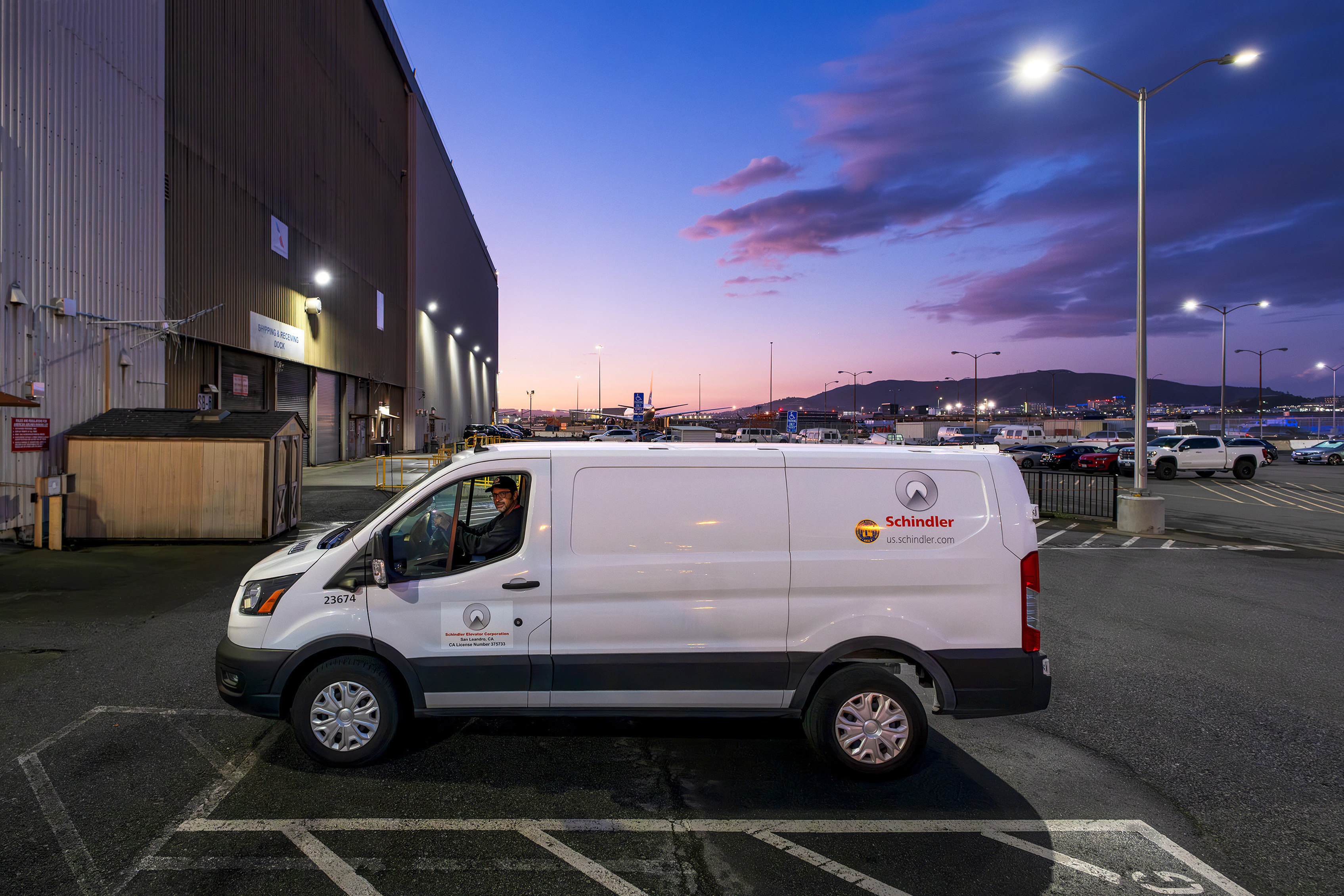 George Ortiz has just finished servicing an elevator in Parking Garage B, and is now back in his electric van, heading to the United Airlines hangar to take care of a freight elevator. Overhead, a jet roars in for landing, but he doesn’t flinch – it’s the soundtrack to his work.